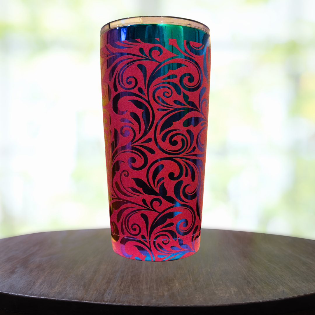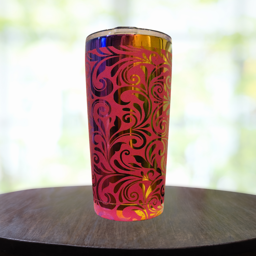 Introducing the 20oz Rainbow and Hot Pink Filigree tumbler, a perfect blend of style and functionality. This eye-catching tumbler features an intricate filigree design that adds a touch of elegance to your daily hydration routine.