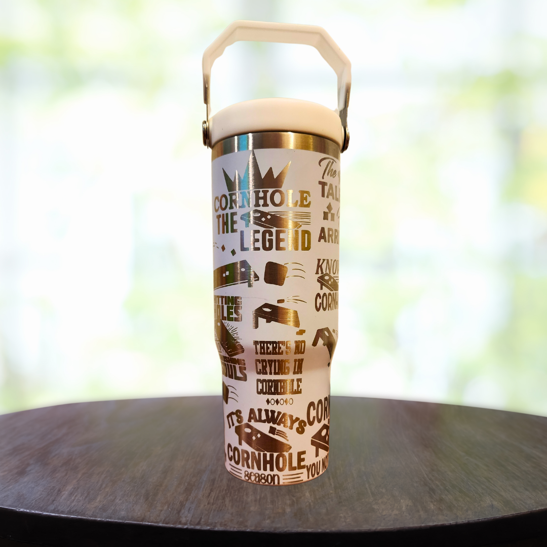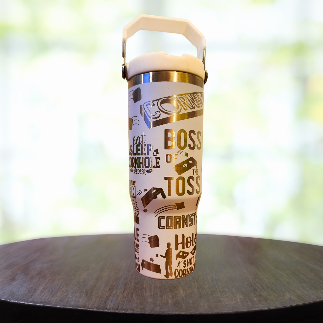 Introducing the 30oz Swing Handle Corn Hole Tumbler, a perfect companion for game enthusiasts. This tumbler is designed to celebrate your love for the classic game of corn hole, making it an ideal accessory for outdoor gatherings.