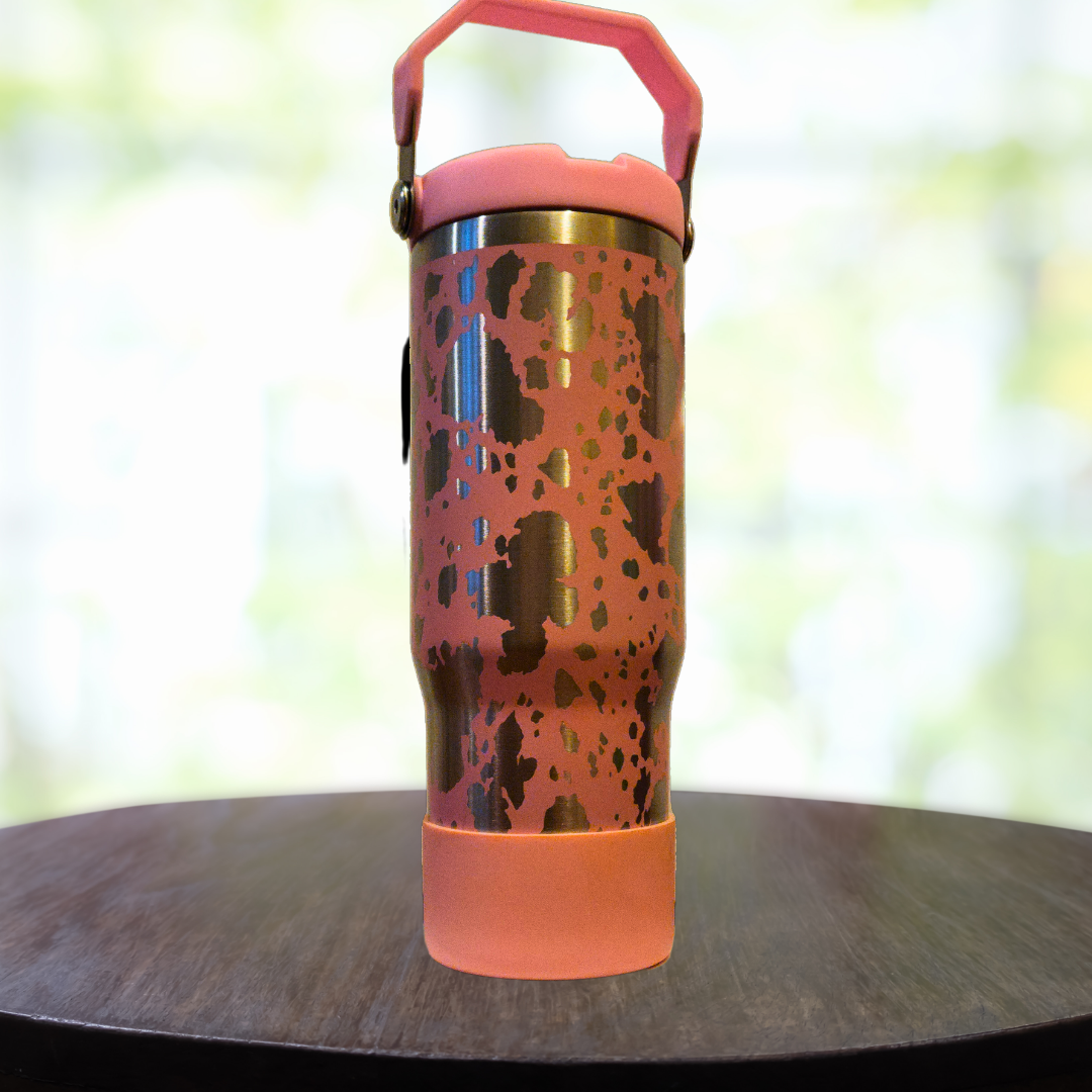 Introducing the 30oz Swing Handle Cowhide Tumbler, a perfect blend of functionality and rustic charm. Crafted for those who appreciate unique designs, this tumbler features a stunning cowhide pattern that adds a touch of the countryside to your drinkware collection.