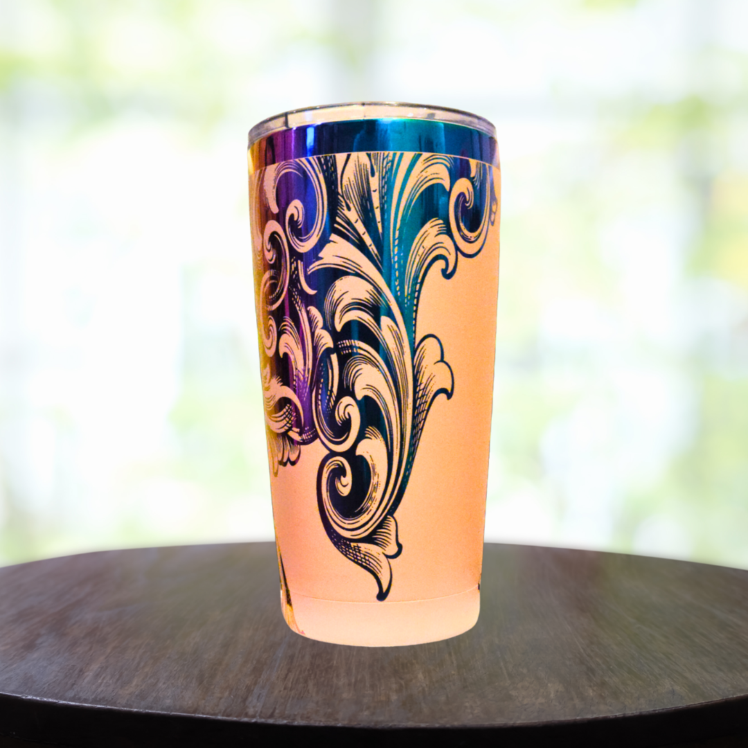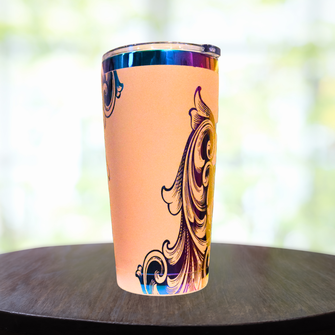 Make every sip a celebration of style with the 20oz Rainbow and Light Pink Filigree tumbler.