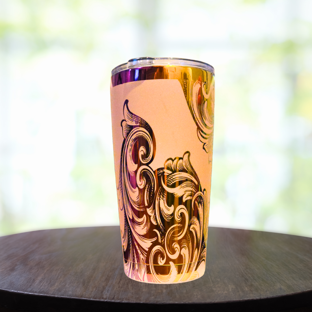Introducing the 20oz Rainbow and Light Pink Filigree, a stunning blend of elegance and functionality. This tumbler is not just a vessel; it's a statement piece that elevates your hydration game.