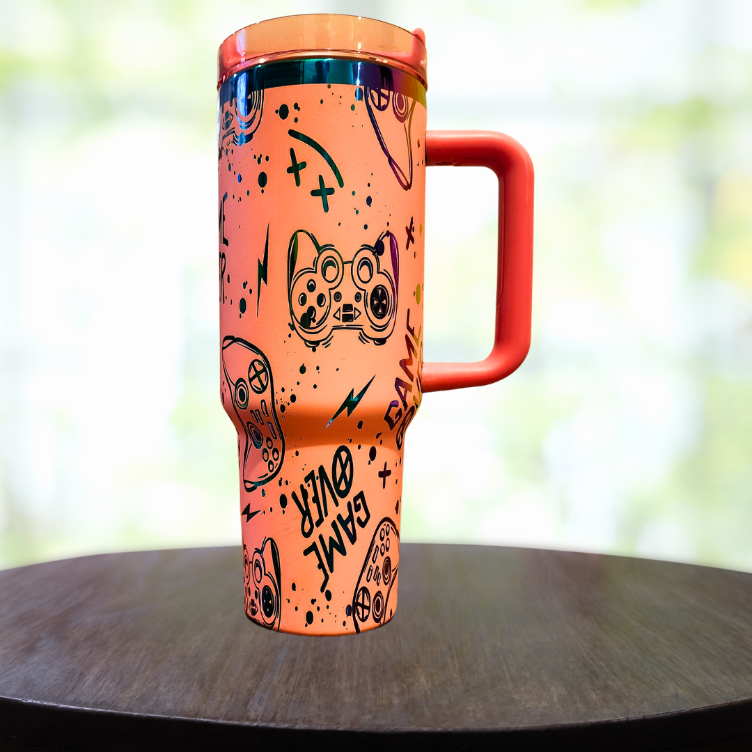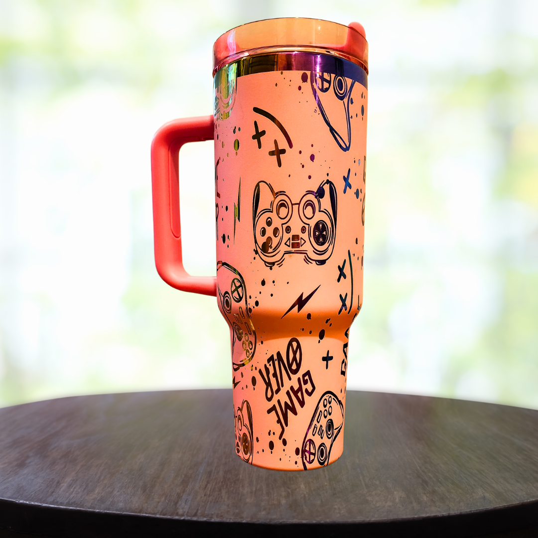 Introducing the 40oz Video Games Tumbler, the ultimate companion for gamers on the go. This stylish tumbler is designed to keep your favorite beverages at the perfect temperature, whether you're deep in a gaming session or taking a break.